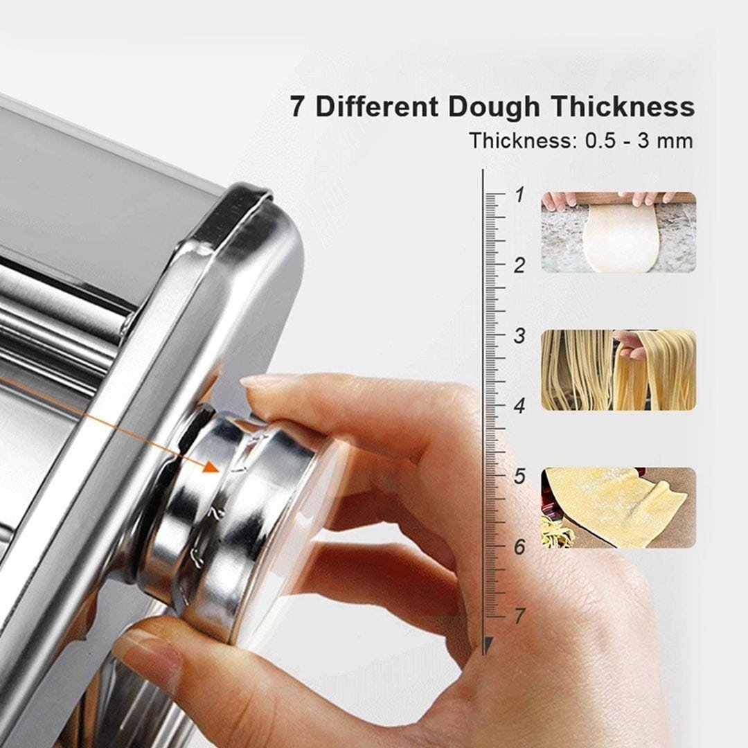 【سماكات قابلة للتعديل】 تأتي آلة المعكرونة بشفرتين من الفولاذ المقاوم للصدأ: 2.0 مم (شعيرية) / 4.5 مم (فيتوتشيني) و 7 إعدادات مختلفة لسمك العجين (0.5 – 3 مم) لسماكات مختلفة من المعكرونة.