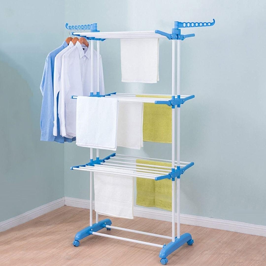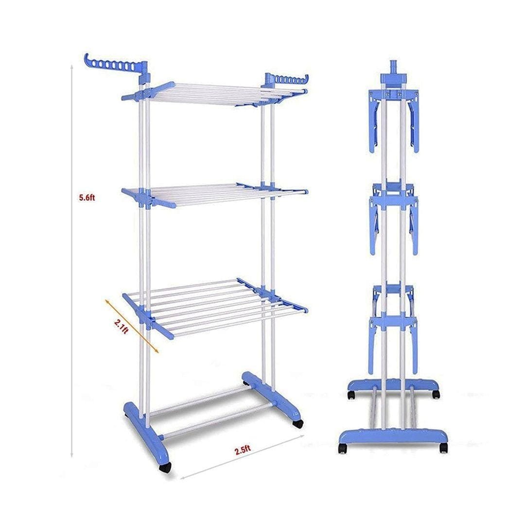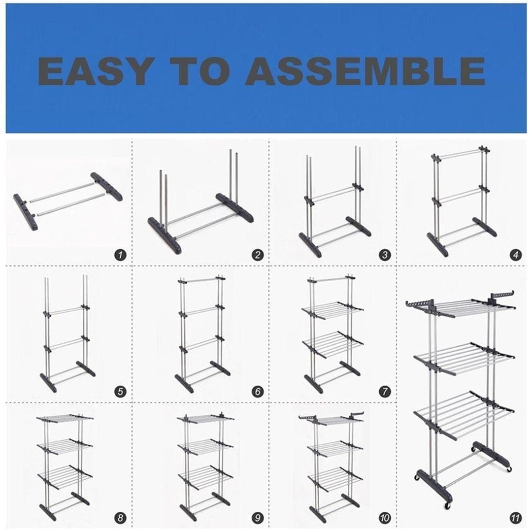– عجلات في الجزء السفلي لتحريك الحامل بسهولة. يمكن أن تتحمل القضبان الفولاذية عالية الجودة والمتينة وزن الملابس الثقيلة المبللة.