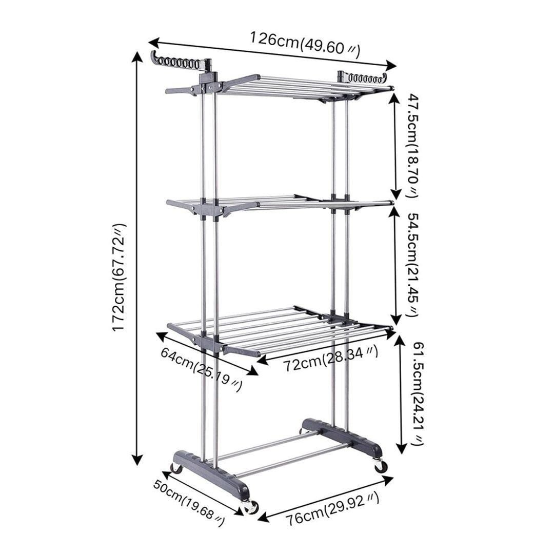 – كما أن بها رفوف قابلة للطي لتجفيف الملابس الثقيلة ، وخطافان لتعليق الشماعات ومساحة خاصة للملابس الصغيرة.